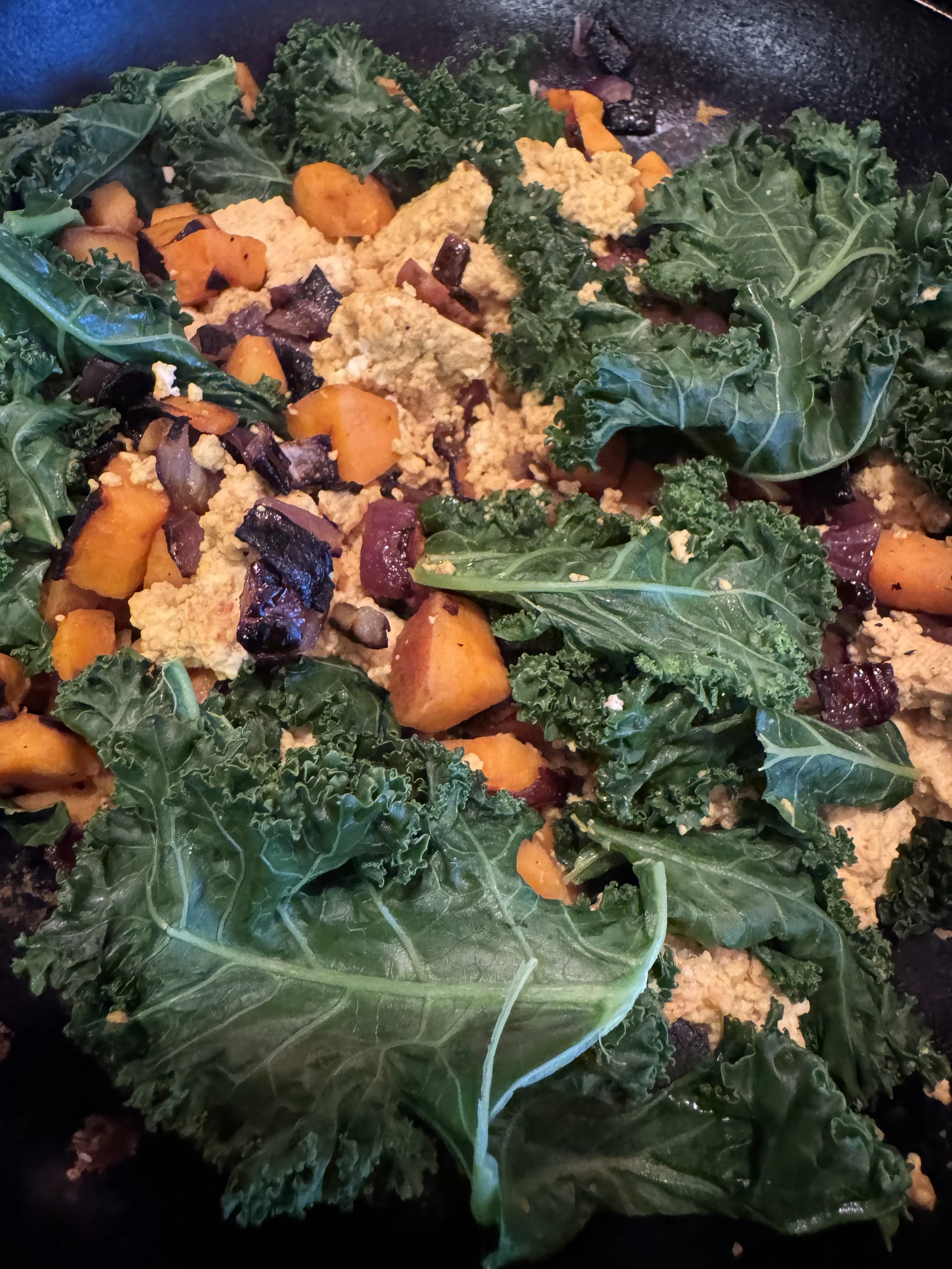 Tofu scramble with kale, sweet potatoes and red onions. Yum!