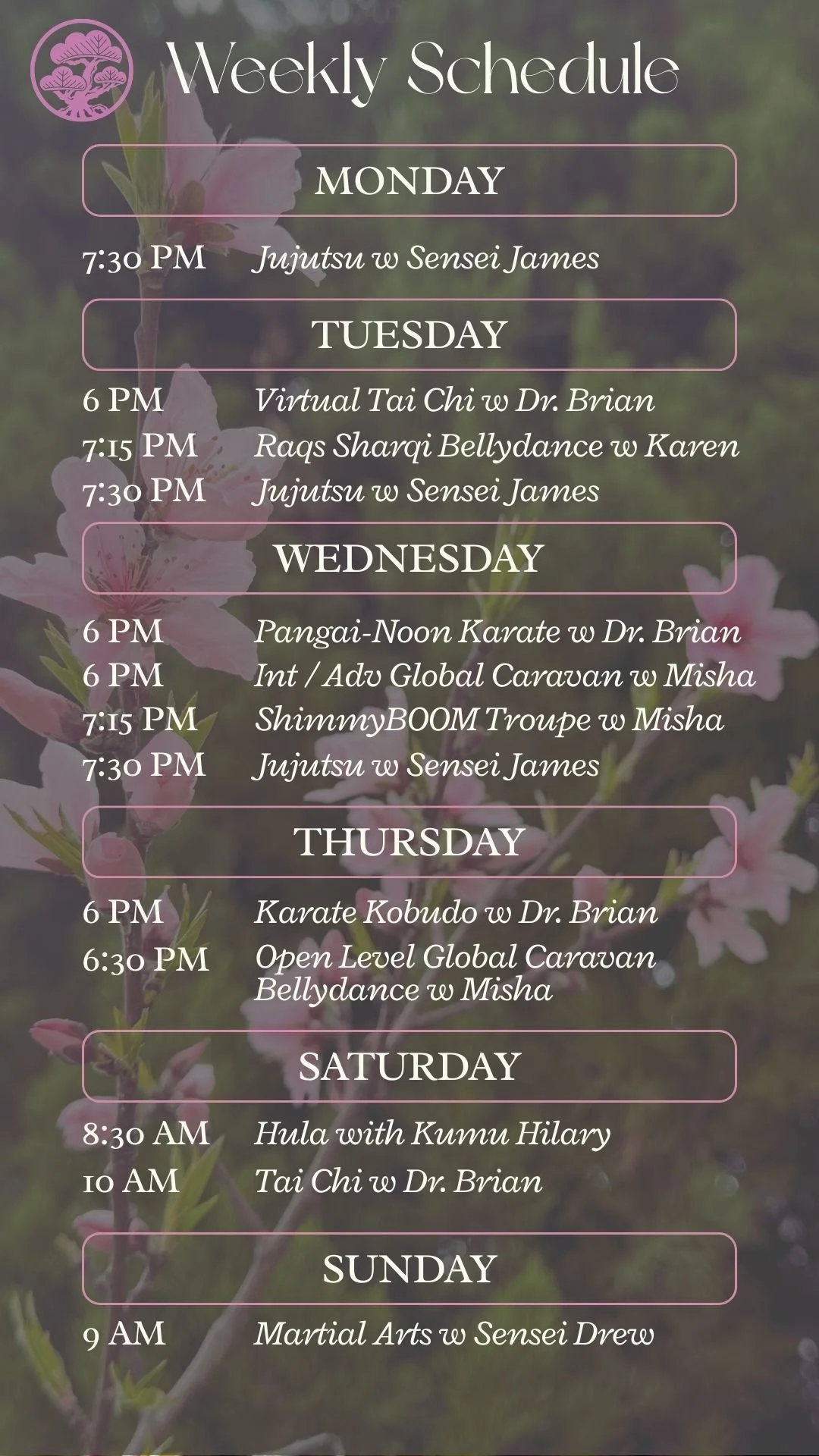All classes are held in person! The Cypress Pillar Virtual Academy is also open! Many of our weekly classes and monthly workshops are now available either as live streaming or recorded video. If you are unable to join us in person, please visit this link to find out how you can study with us virtually. Classes that are currently available for streaming are marked with a **